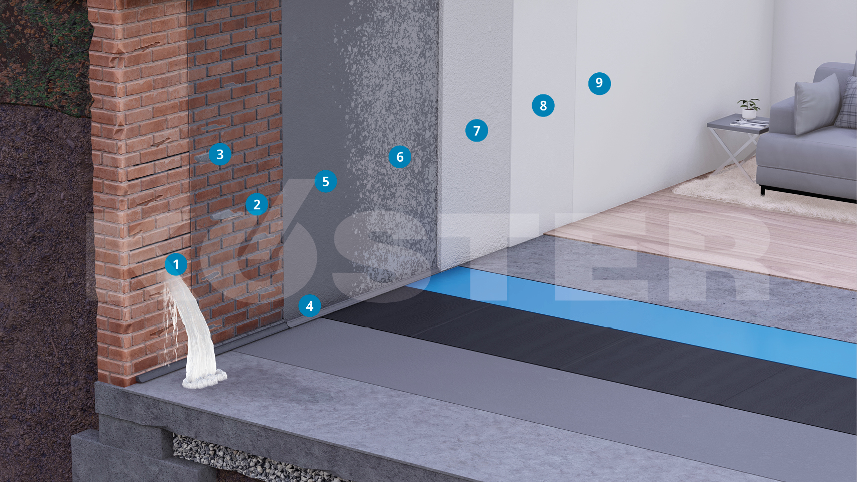 Στην περίπτωση που οι τοίχοι του υπογείου έχουν υποστεί ζημιά από υγρασία θα πρέπει να εφαρμόζεται ο σοβάς KÖSTER Restoration Plaster. Οι σοβάδες KÖSTER Restoration Plasters είναι ειδικά σχεδιασμένοι για την αποκατάσταση τοιχοποίας με υψηλή περιεκτικότητα σε άλατα και υγρασία. Οι σοβάδες KÖSTER Restoration Plasters βοηθούν στην αποβολή της υγρασίας από τον τοίχο και στην απορρόφηση των εναπομεινάντων αλάτων. Δεν περιέχουν ασβέστη ή γύψο, επιτρέπουν τη διάχυση υδρατμών και δημιουργούν ένα υγιές και άνετο περιβάλλον στον χώρο.