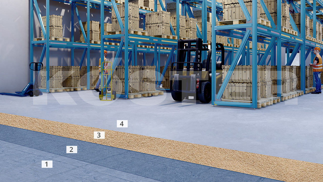 Στα δάπεδα από σκυρόδεμα που υπόκεινται σε τέτοιες καταπονήσεις εφαρμόζεται το αυτοεπιπεδούμενο βιομηχανικό δάπεδο KÖSTER LF-VL.