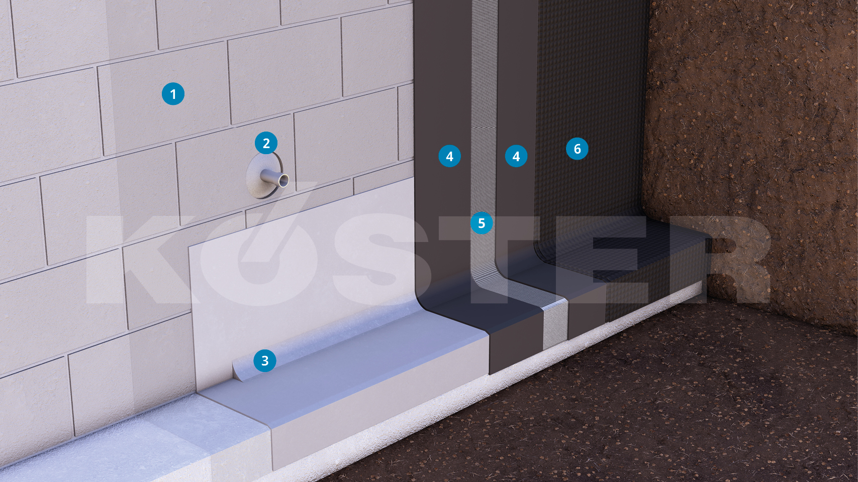 Η κύρια στεγανοποίηση της περιοχής επιτυγχάνεται χρησιμοποιώντας το KÖSTER Deuxan 2C σε δύο στρώσεις οι οποίες εφαρμόζονται με σπάτουλα. Το KÖSTER Deuxan Professional μπορεί να εφαρμοστεί με ψεκασμό. Για μεγαλύτερη ευκολία χειροκίνητης εφαρμογής, χρησιμοποιήστε το KÖSTER Bikuthan 1C ή 2C. Η προσθήκη υαλοϊνών KÖSTER συνιστάται σε όλες τις πυκνές σφραγιστικές μεμβράνες και σε όλες τις εφαρμογές. Αυτό επιτρέπει τον καλύτερο έλεγχο του πάχους της επικάλυψης και απορροφά με ασφάλεια τις κινήσεις του κτηρίου.