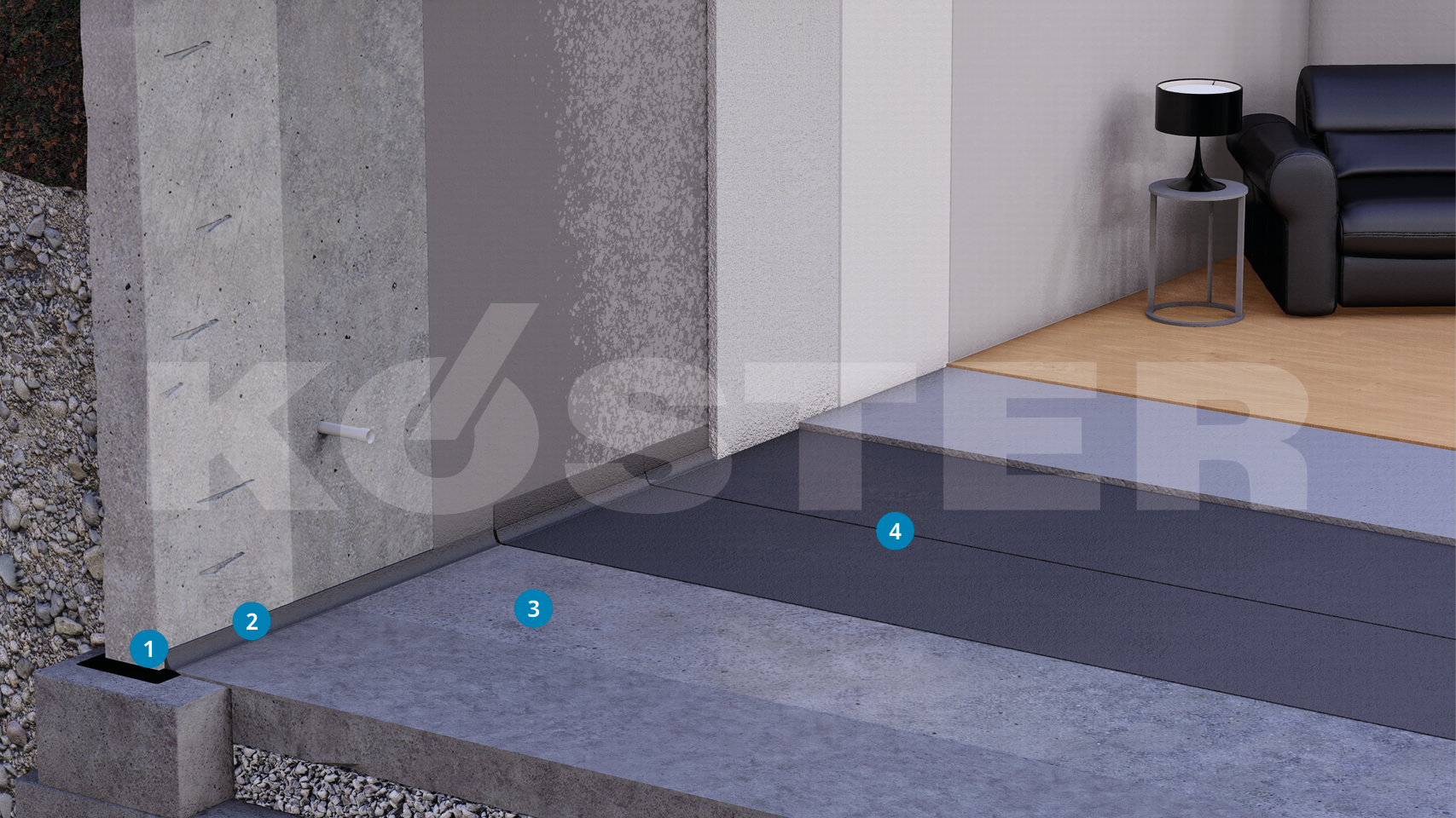 Για την σκλήρυνση του υποστρώματος εφαρμόζεται ως αστάρι το KÖSTER Polysil TG 500 στην πλάκα θεμελίωσης. Στην ένωση τοίχου / δαπέδου εφαρμόζεται μια στρώση του KÖSTER Repair Mortar plus για την αποφυγή τάσεων στις επόμενες στρώσεις στεγάνωσης.