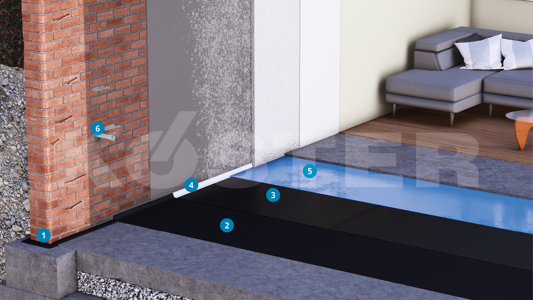 Προς αποφυγή ανερχόμενης υγρασίας, είναι απαραίτητη η εγκατάσταση οριζοντίου φράγματος πίσω από τον τοίχο με τη χρήση του KÖSTER Fix-Tape 10 SY. Στην ένωση τοίχου / δαπέδου εφαρμόζεται μια στρώση του KÖSTER Repair Mortar plus για την αποφυγή τάσεων στις επόμενες στρώσεις στεγάνωσης.