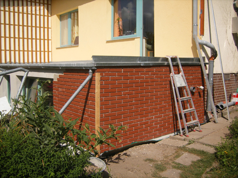Nach erfolgter Abdichtung der Kellerwände kann die Außenwand mit Ziegeln verblendet werden