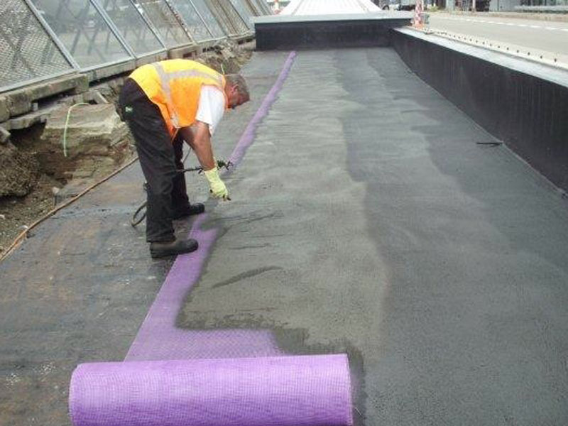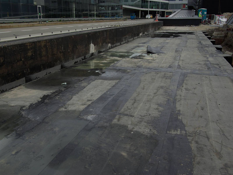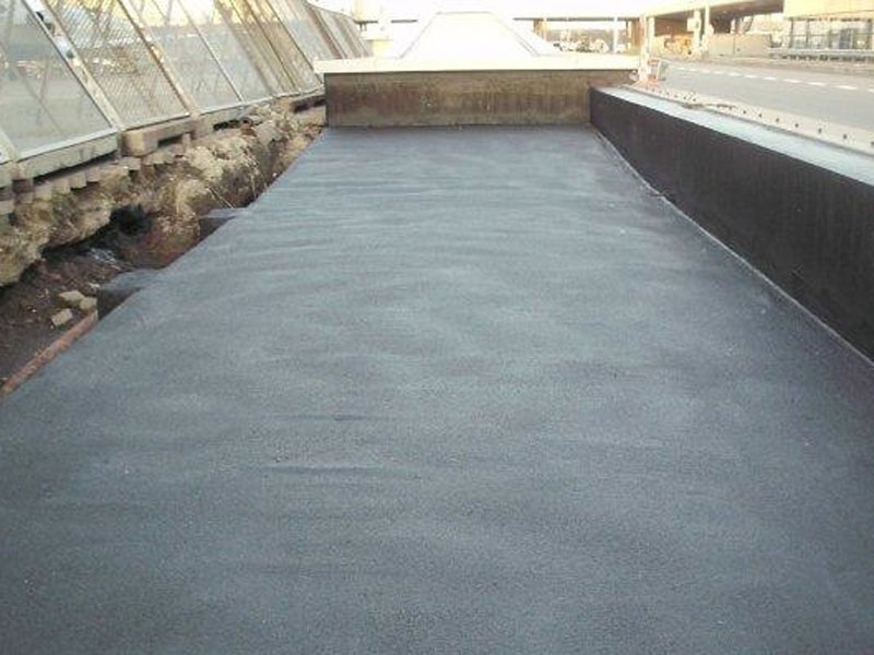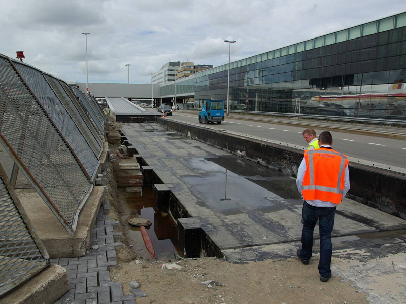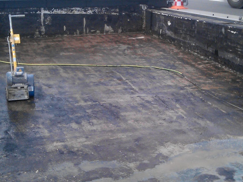Due to resonances from traffic and plaines there were cracks in the concrete. The previous damaged waterproofing (bitumen welding membrane) has been replaced by a sprayed application of KÖSTER Deuxan® 2C and KÖSTER Glass Fibre Mesh.