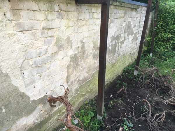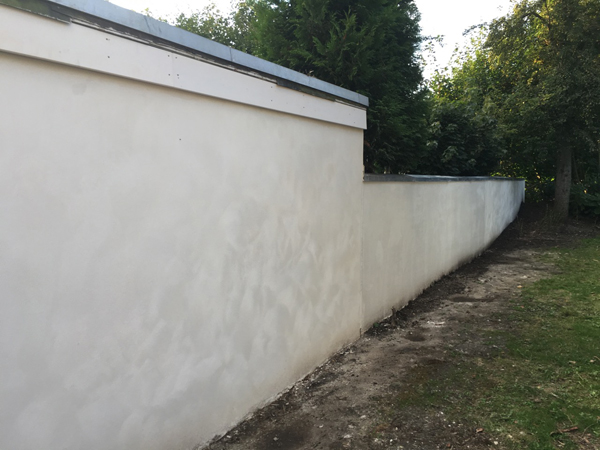 Der bestehende Kalkputz der Gartenwand war verwittert und nur noch zu geringen Teilen vorhanden. Eine Horizontalsperre bestand noch. Der Kalkputz wurde restlos entfernt, die Fugen wurden ausgekratzt. Im Sockelbereich wurde eine Abdichtung mit KÖSTER Sperrmörtel und KÖSTER NB 1 aufgebracht. Der flächige Untergrundausgleich wurde mit KÖSTER Sanierputz grau erstellt. Darauf wurde mit KÖSTER Feinputz verputzt. Die offene Fuge wurde aufgeschnitten und mit KÖSTER Sperrmörtel begradigt sowie mit KÖSTER FS Fugenspachtel grau abgedichtet.