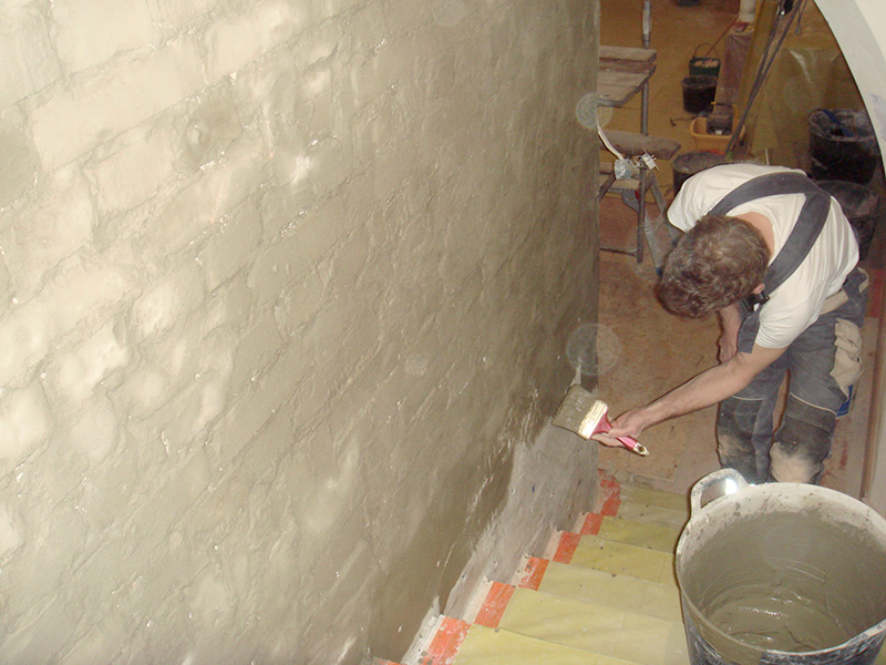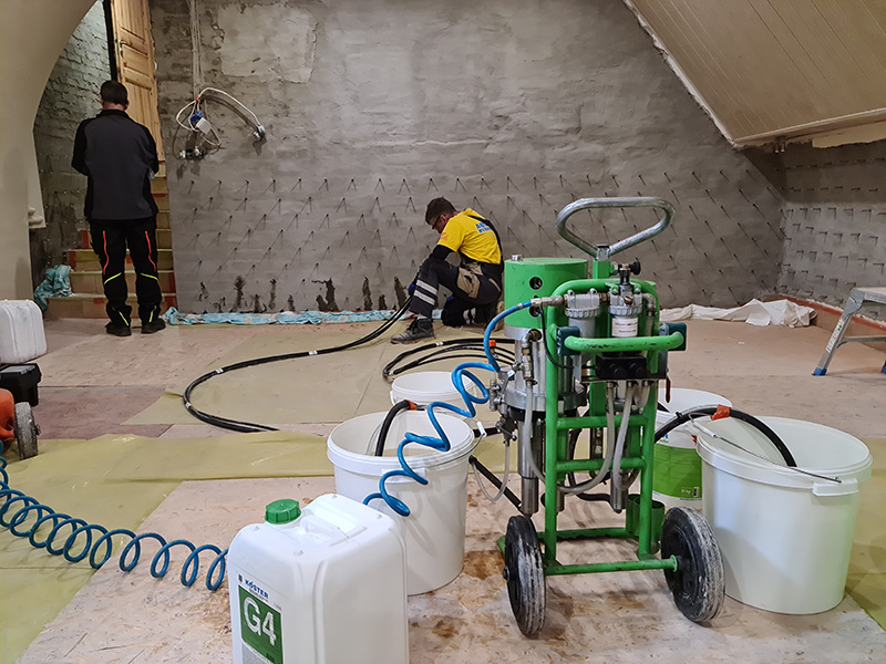 Uszczelnienie ścian piwnic w technice iniekcji strukturalnej żelem akrylowym. Zawilgocone i przeciekające ściany piwnic zostały zagruntowane preparatem KOSTER POLYSIL TG 500 oraz uszczelnione szlamem uszczelniającym KOSTER NB1. Następnie wykonano iniekcję strukturalną ścian żelem akrylowym KOSTER INjektionsgel G4 oraz system szerokoporowych tynków renowacyjnych KOSTER Sanierputz.