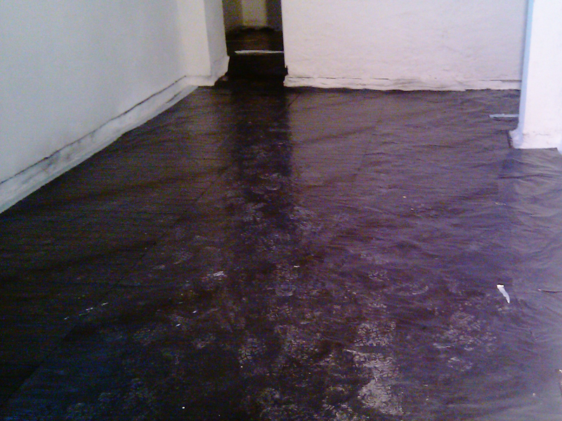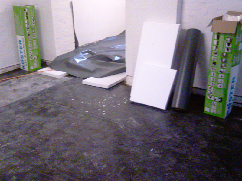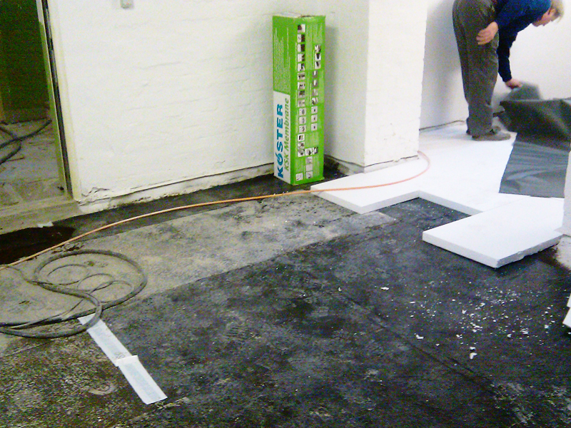 Bodenabdichtung auf Beton im EG unter Estrich Ca. 800 m2 mit Kehlenausbildung. Weiterhin ca. 5 Paletten KÖSTER Sanierputz 2 weiß an Innenwänden.